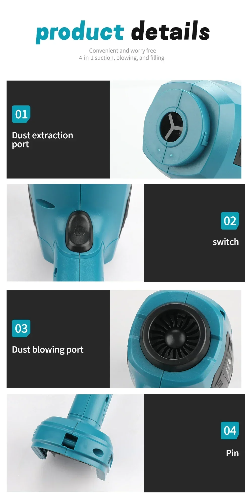 Componentes Estrutural: Equipado com uma saída de poeira, uma porta de saída de poeira, um interruptor, uma interface de bateria (para instalação da bateria). Ele adota um motor sem escova de alto desempenho e um design de duto de ar duplo.
